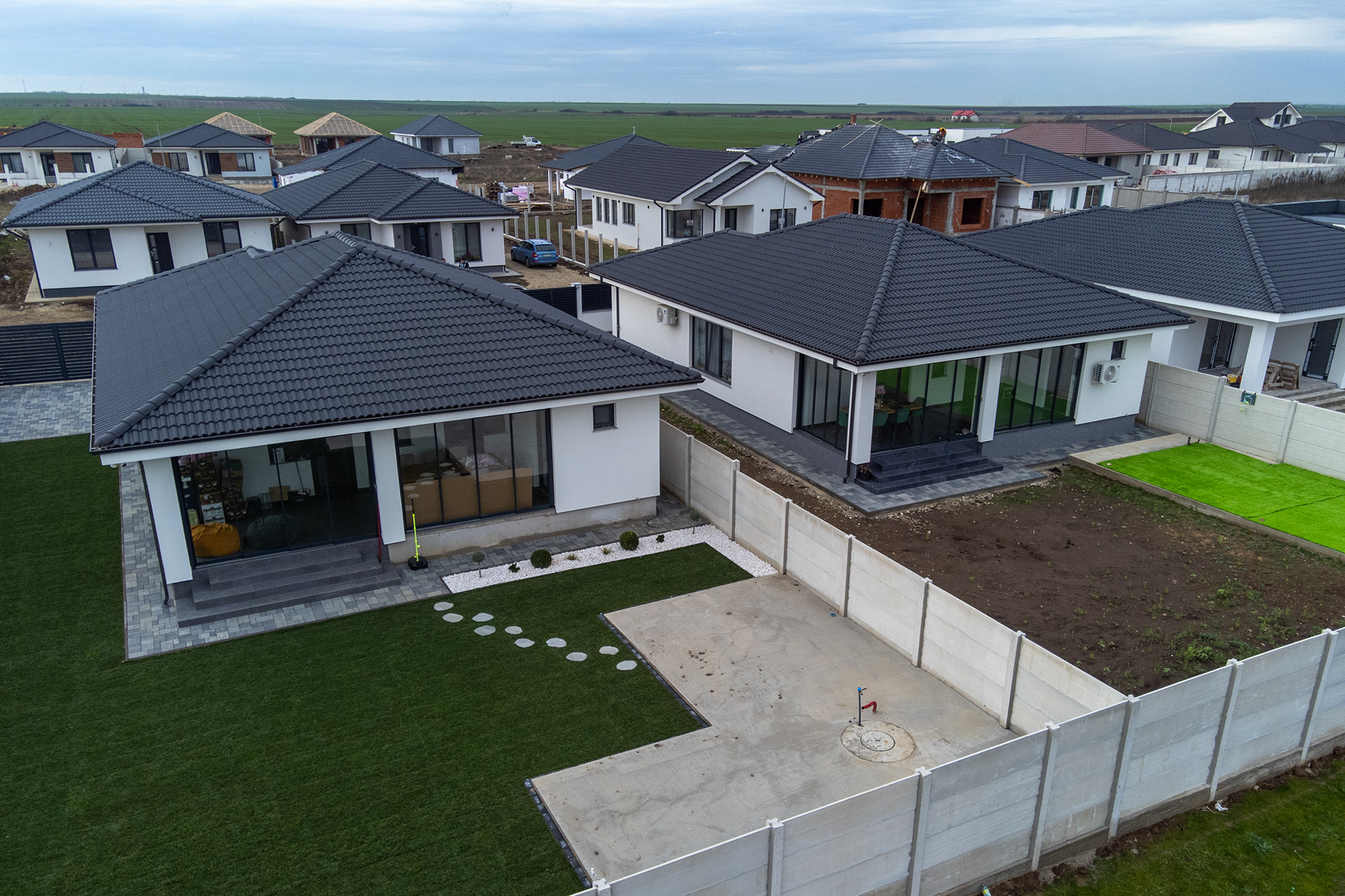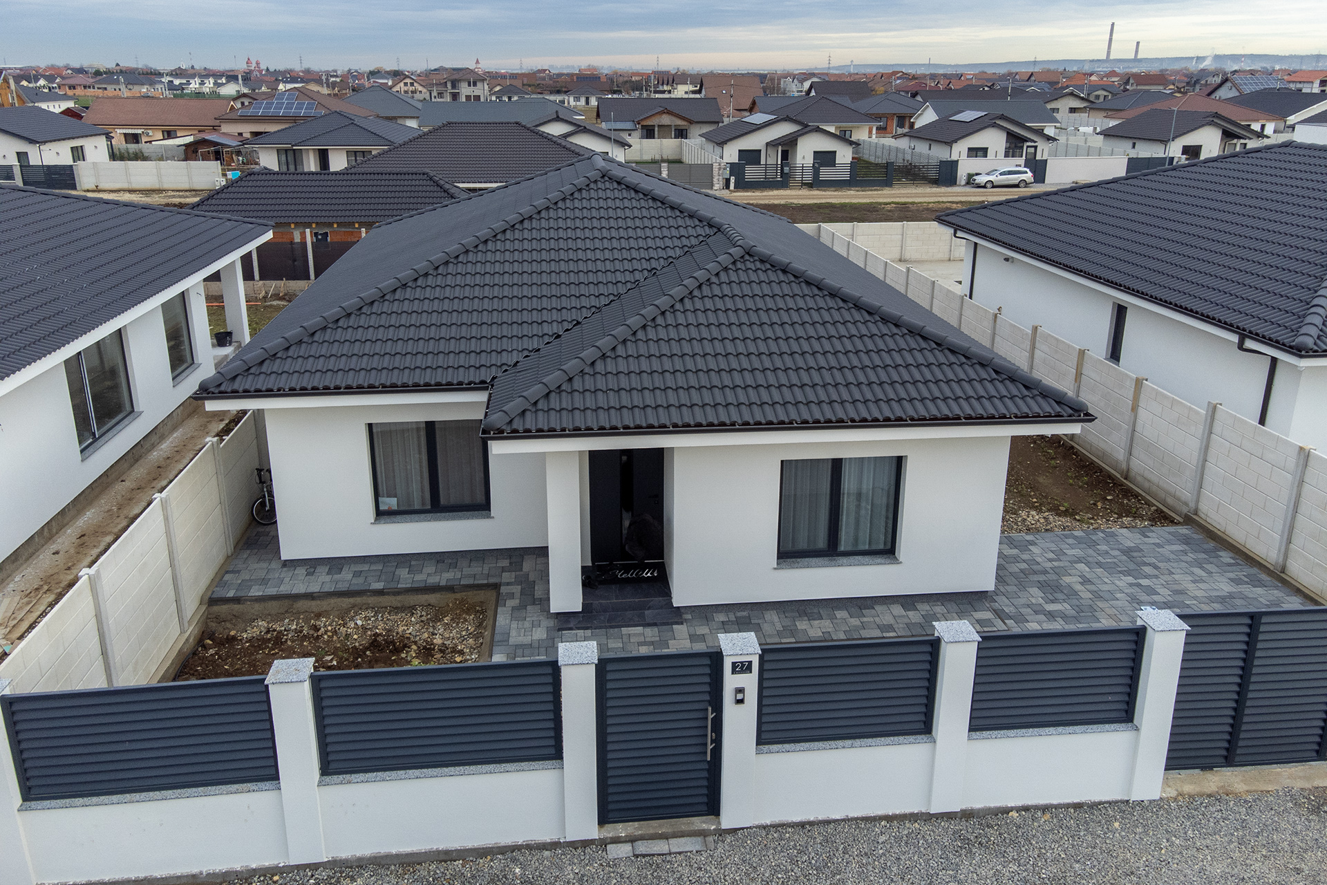 Acoperișul este realizat cu țiglă din Incop de beton, un material extrem de rezistent la intemperii, variații de temperatură și acțiunea timpului. Asigură o protecție solidă a locuinței, stabilitate structurală și un aspect estetic modern și durabil.