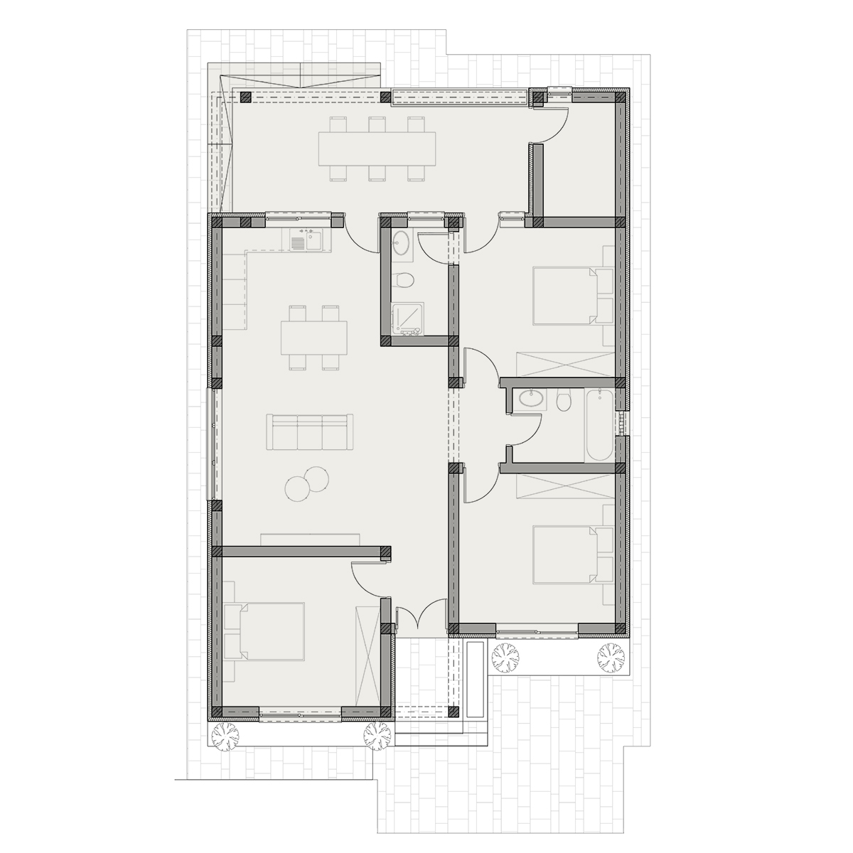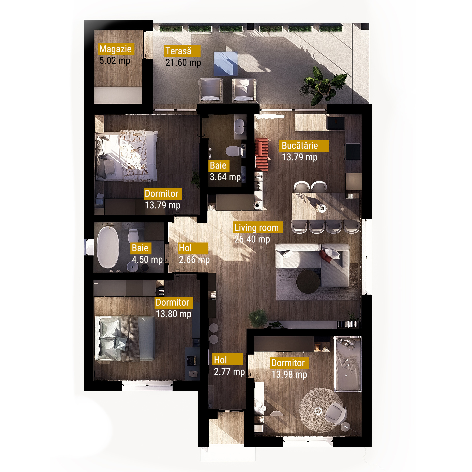 Spațiu generos și bine organizat, cu living deschis, două băi și o terasă mare, perfectă pentru relaxare în aer liber.